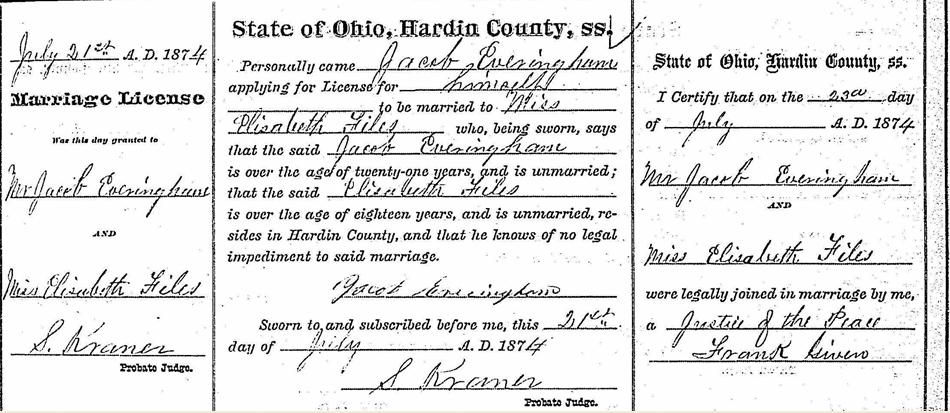 1874 Pg. 134 Marriage Register, Hardin County, Ohio ... Jacob Everingham & Miss Elisabeth Files, marriage license July 21, 1874,.. Married July 23, 1874 by Justice of the Peace.