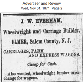 1871 (right) Business advertisement from the Advertiser & Review News, Wed, Nov 1, 1871, Bridgeton, New Jersey. The ad shows that his business is located in Elmer, Salem County, New Jersey. He learned the Wheelwright trade from his father. It was a 3rd generation (or more) family business. His younger brother Joseph had no interest in the family business and worked in the theatre. This ad ran in 1871 & 1872. John also ran ads in Pennsylvania for painting and selling carriages prior to this. John eventually moved back to PA looking for better work.