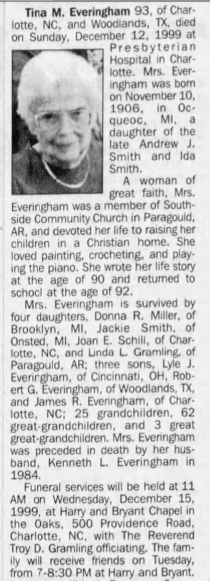 1999 Daily Telegram Newspaper (obituaries), December 21, 1999.. "Tena M. Everingham, 93, of Charlotte, N.C. and Adrian, Mich., died on Sunday, Dec. 12, 1999, at Presbyterian Hosp in Charlotte. Mrs. Everingham is survived by four daughters, Donna R. Miller of Brooklyn, Jackie Smith of Onsted, Joan E. Schill of Charlotte, N.C., and Linda L. Gramling of Paragould, Ark.; three sons, Lyle J. Everingham of Cincinnati, Ohio, Robert G. Everingham of Woodlands, Texas, and James R. Everingham of Charlotte, N.C.; 25 grandchildren, 62 great grandchildren and three great-great-grandchildren. She was preceded in death by her husband, Kenneth L. Everingham, in 1984." (Obituary)