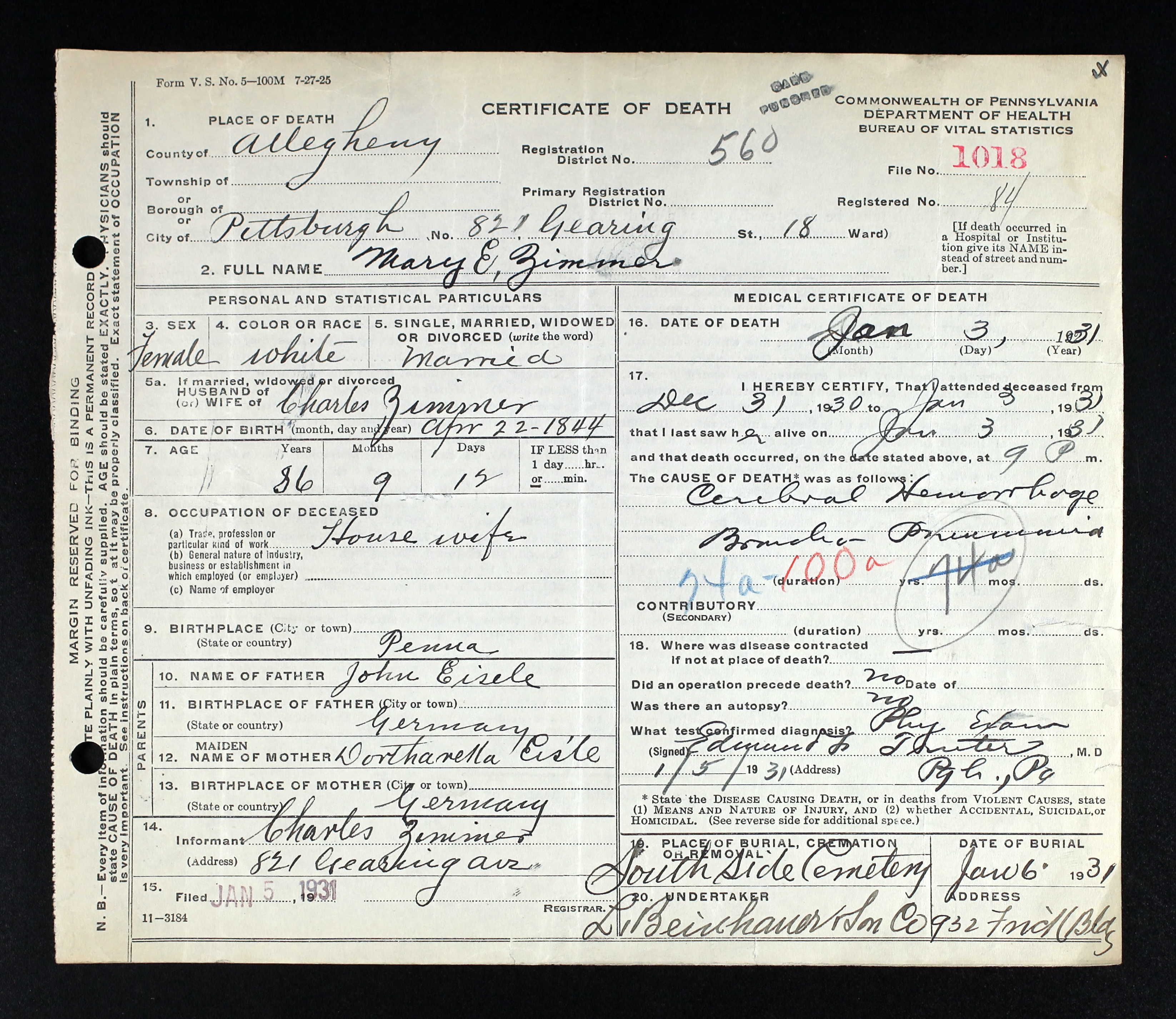 1931 Mary's death certificate at Allegheny, PA, shows she died Jan 3, 1931, age 86y, 9m, 12d. She was the daughter of John & Dorthanella Eisele, both born in Germany. Wife of Charles Zimmer. (Mary's Death Cert)