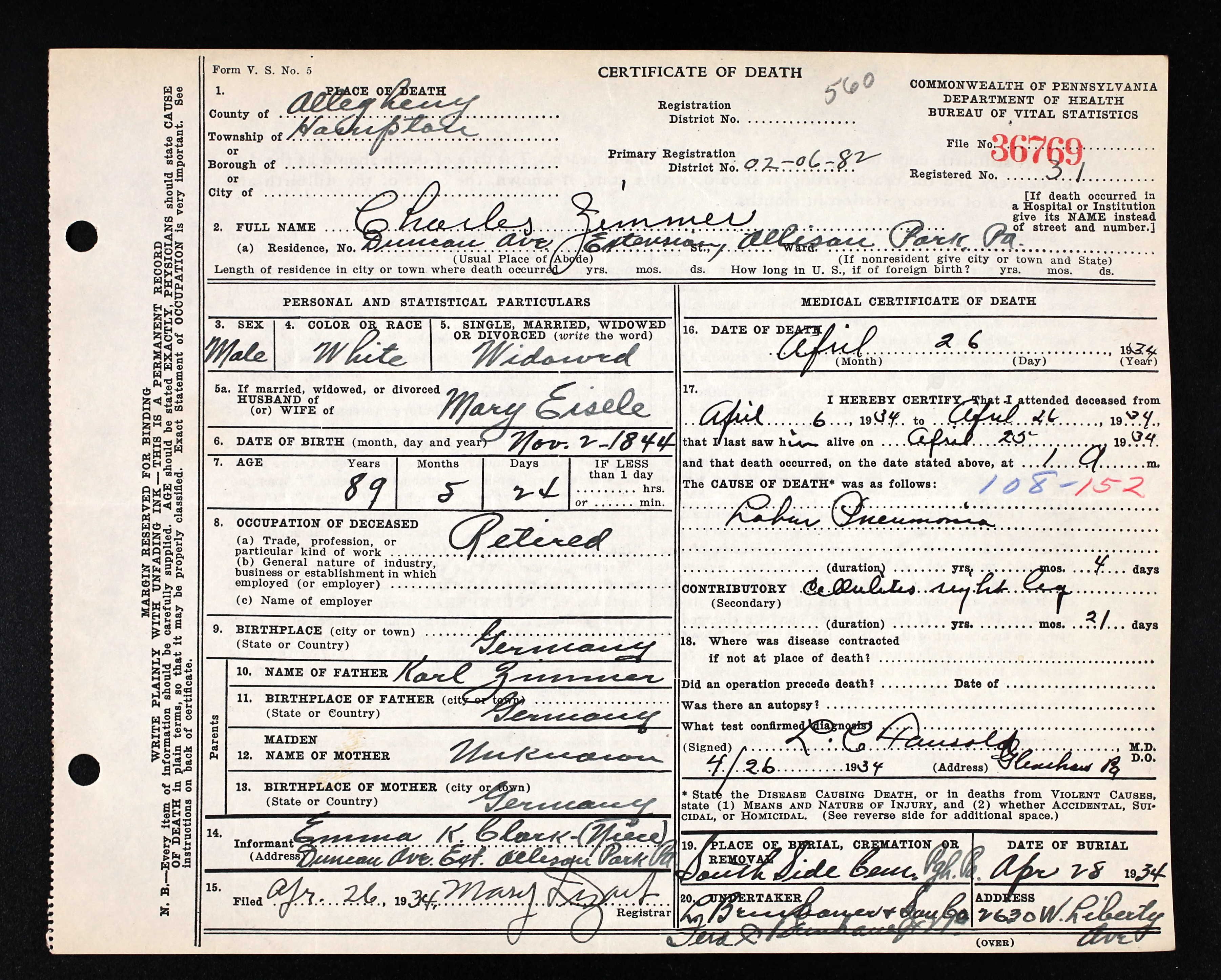 1934 The Pittsburgh Press, Fri, 27th April 1934.. Obituary- "Aged German resident dies at age 89, Charles Zimmer, foremr superintendent of Glass Mill, taken by death. Born in Germany, May 2, 1844, Mr. Zimmer was brought to this country when four, and had lived practically the rest of his life in Pittsburgh. He was the husband of the late Mary Eisele Zimmer.Charles Zimmer's (Death Certificate) "
